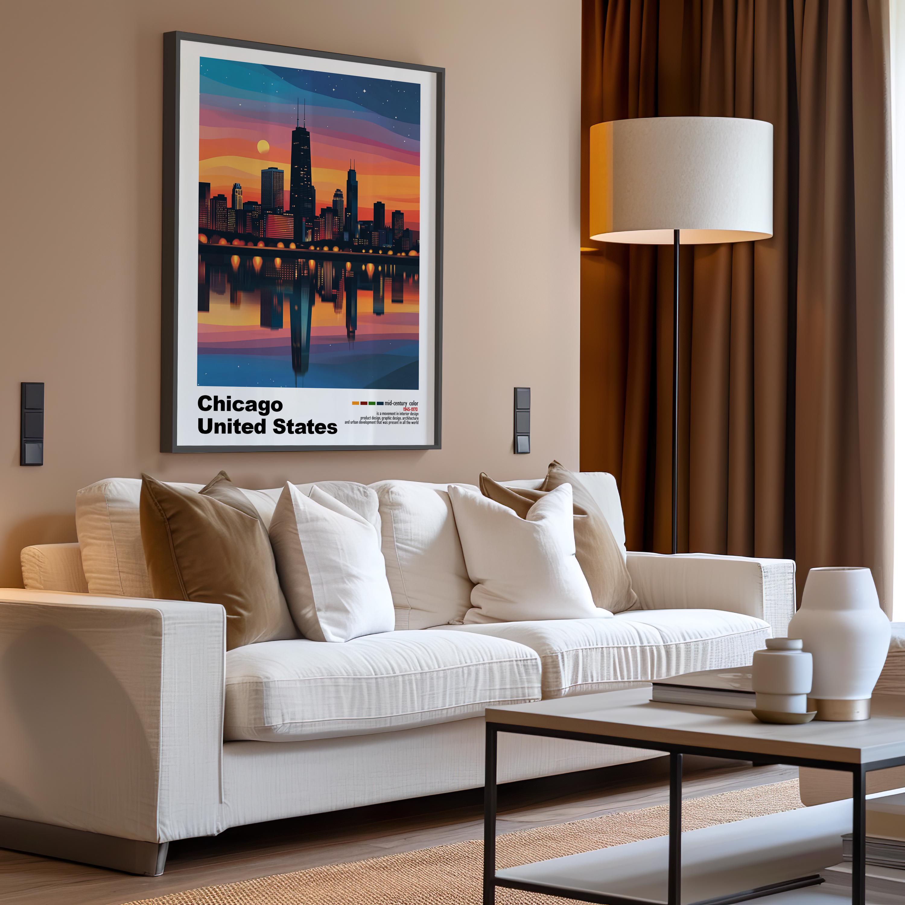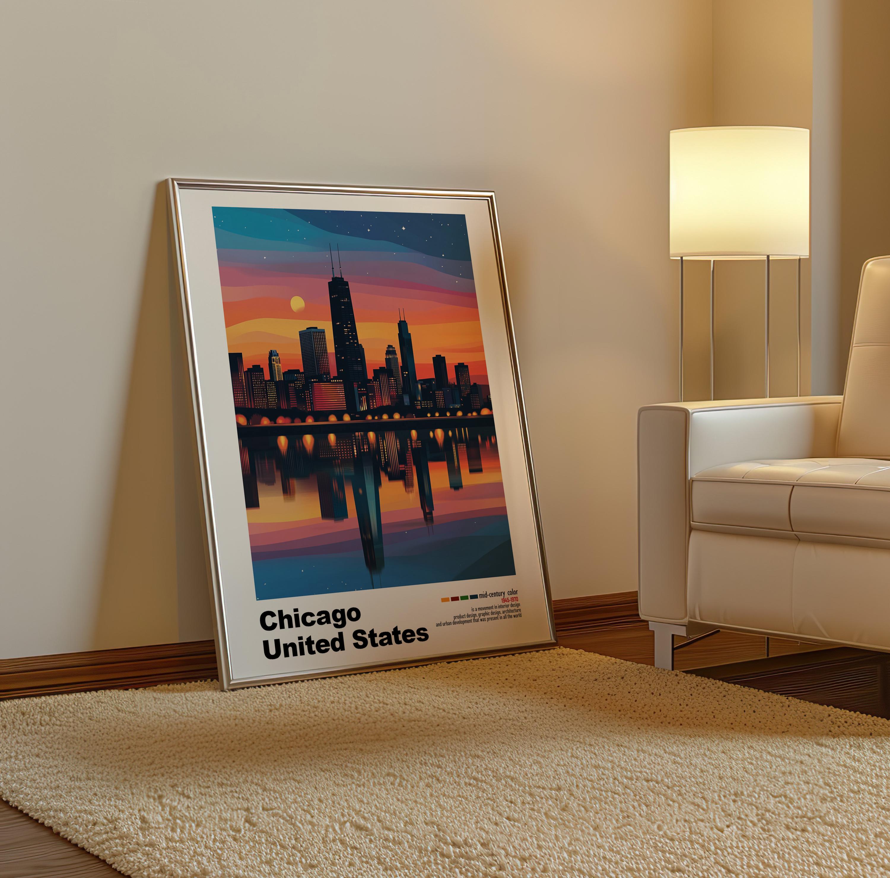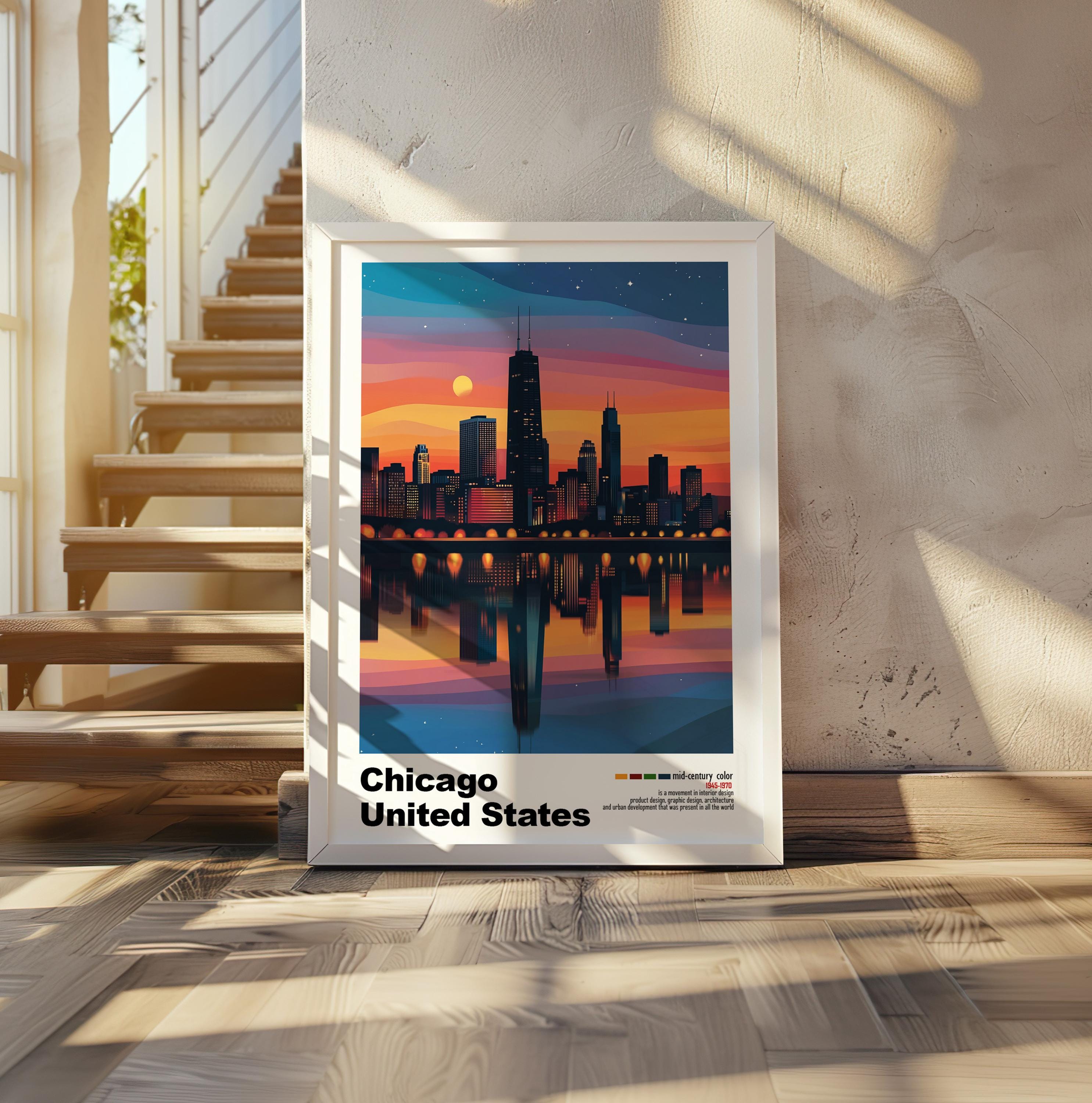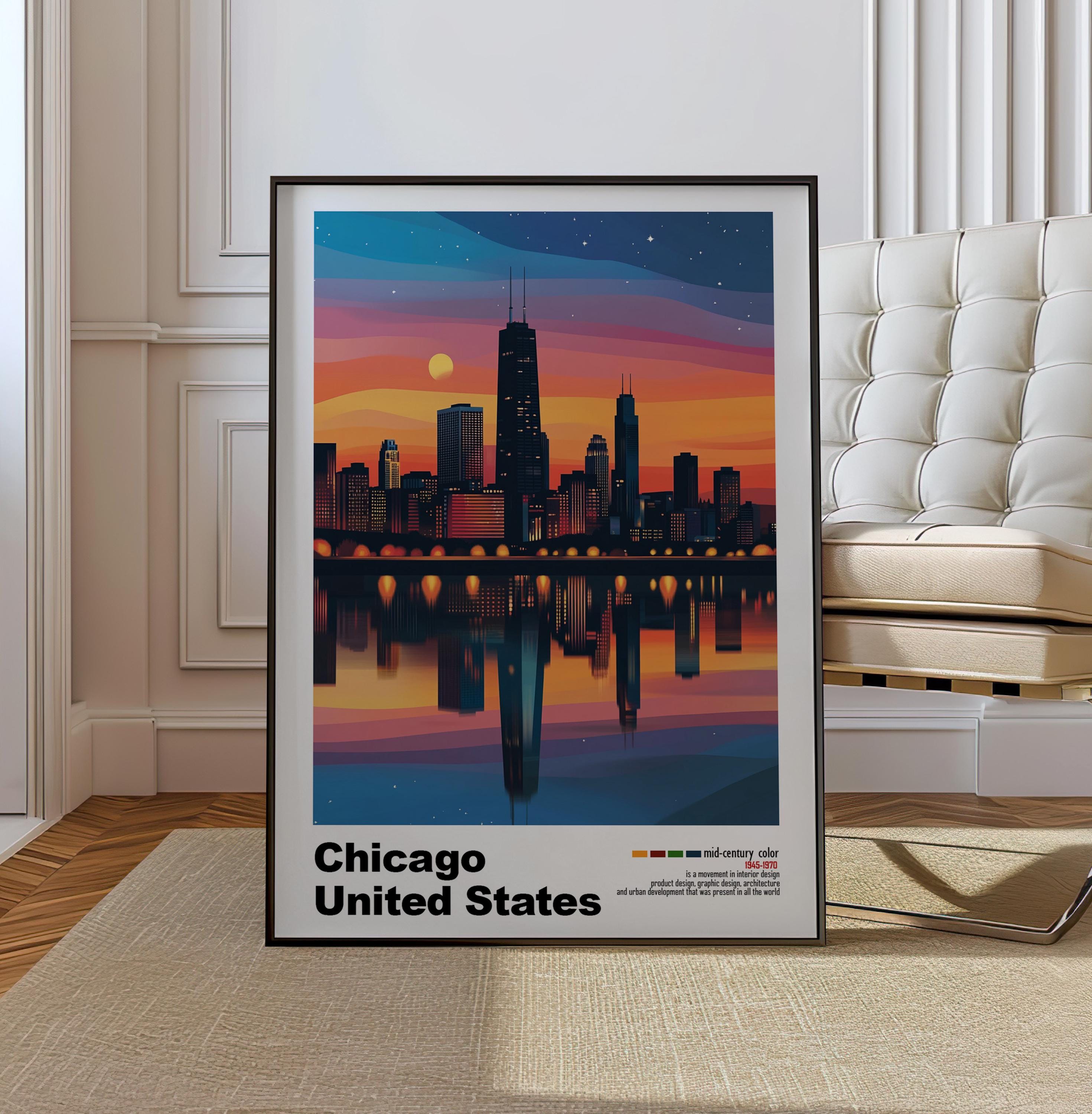 Chicago, USA - Mid-Century Modern Architecture Art Print – Retro Minimalist Poster with Geometric Design - Bold Mid Century Color