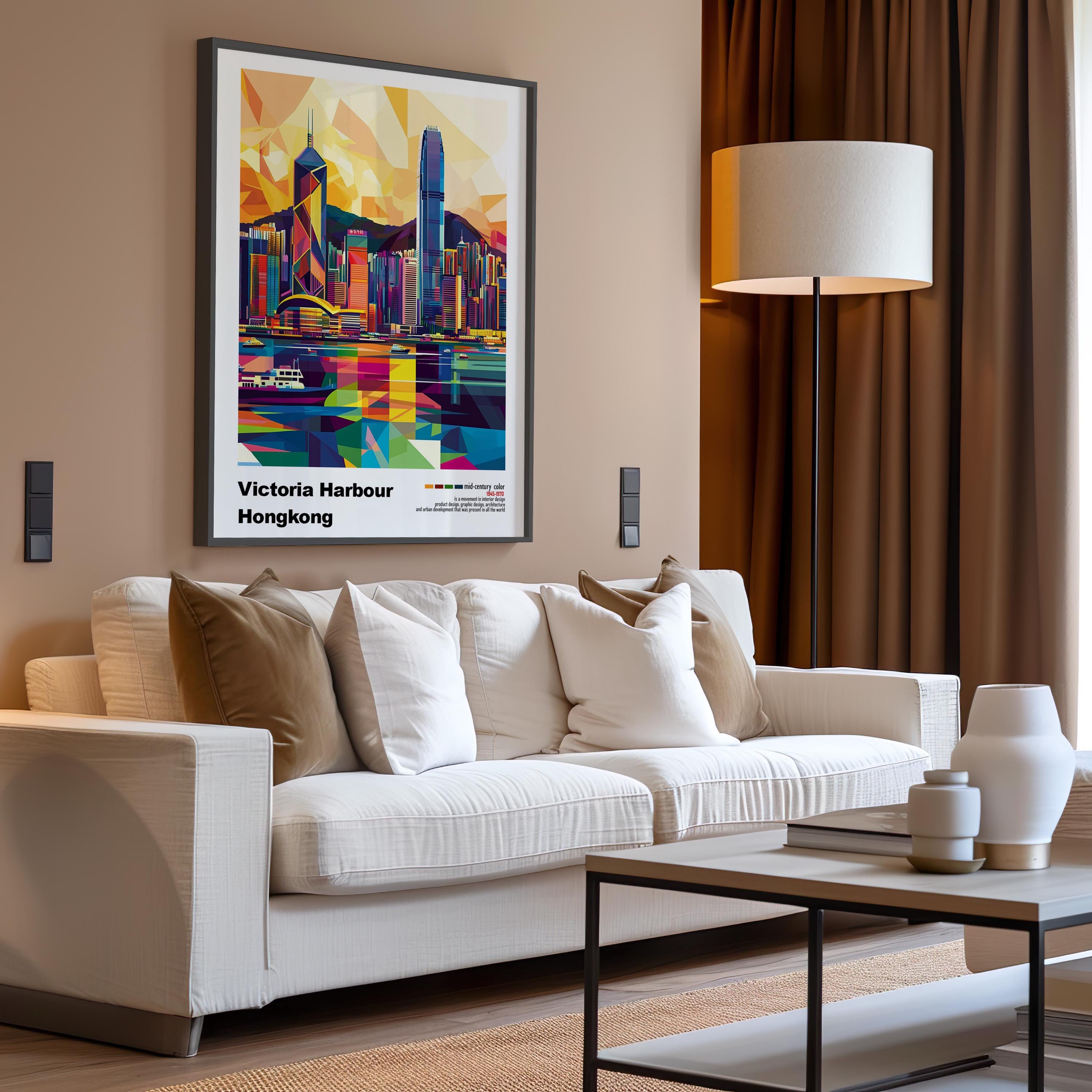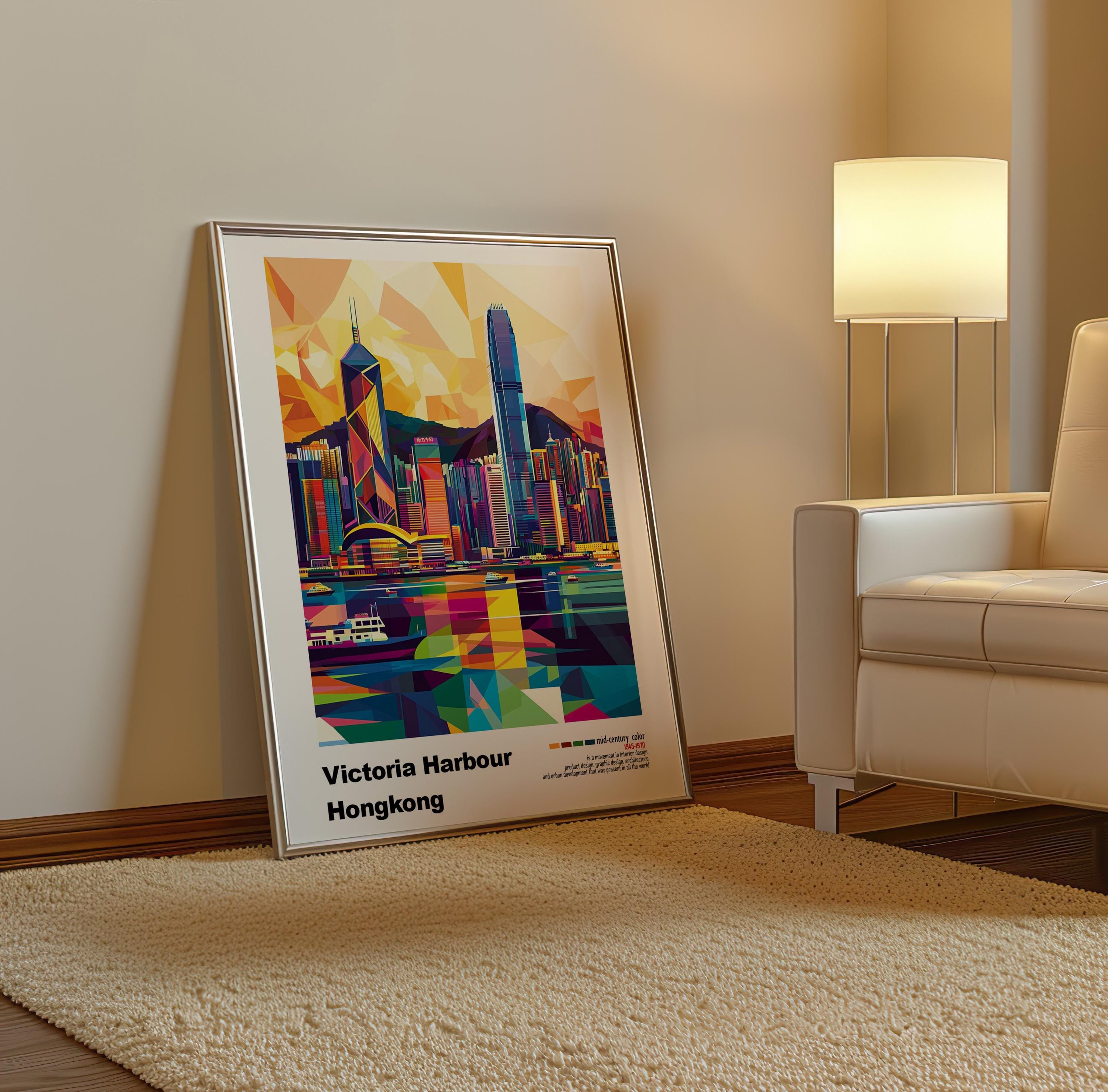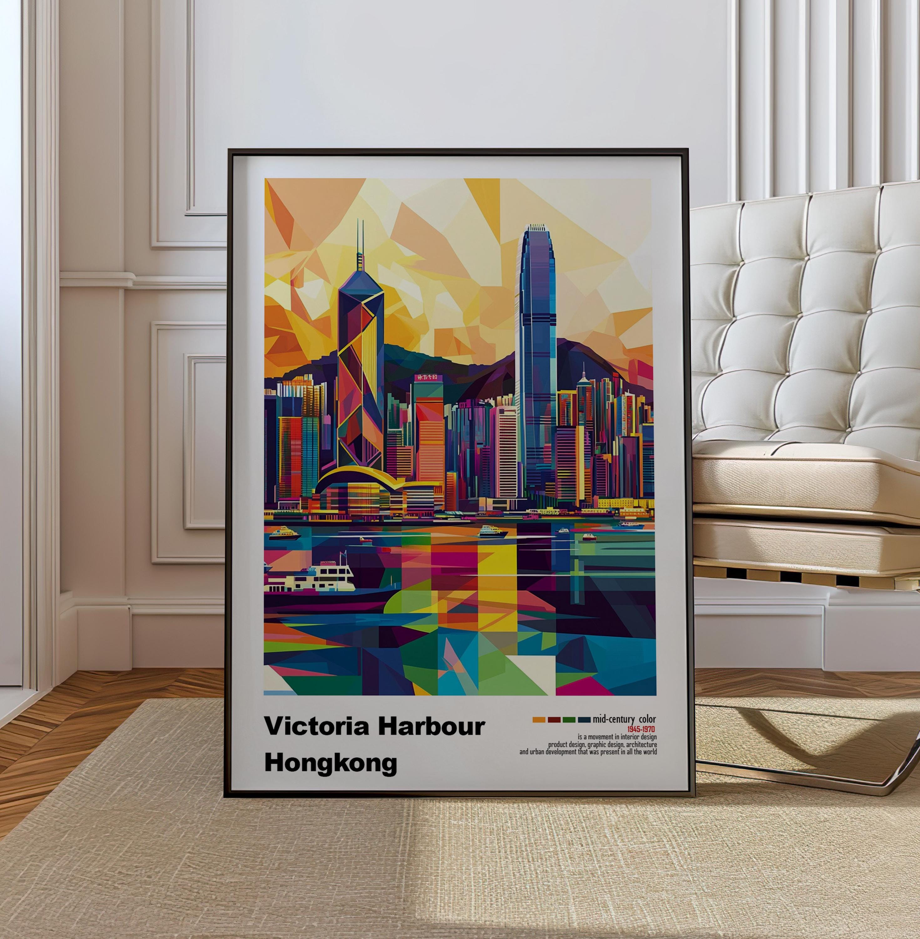Victoria Harbour, Hong Kong - Mid-Century Modern Architecture Art Print – Retro Minimalist City Poster with Geometric Design - Mid Century