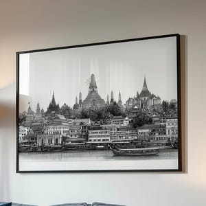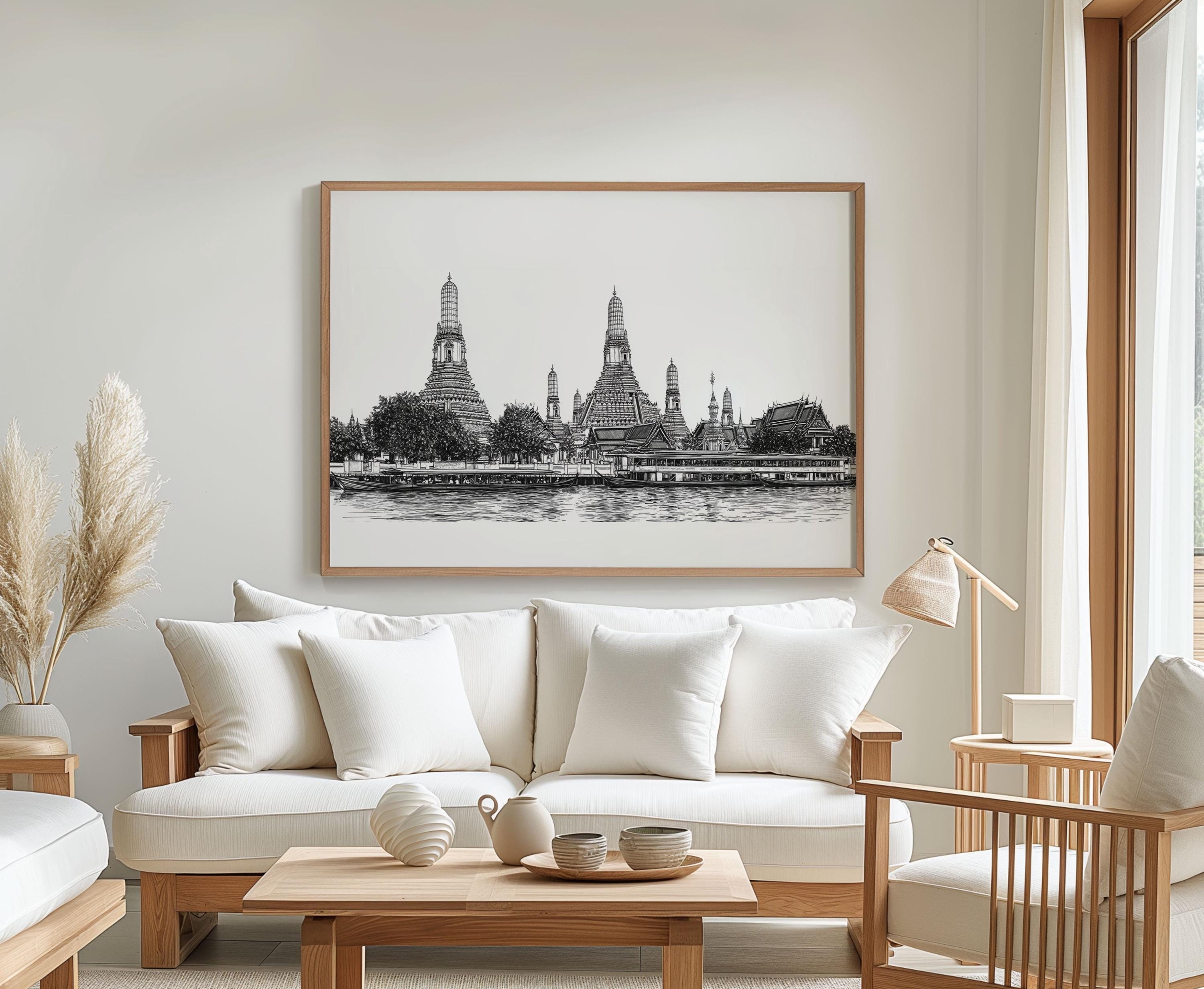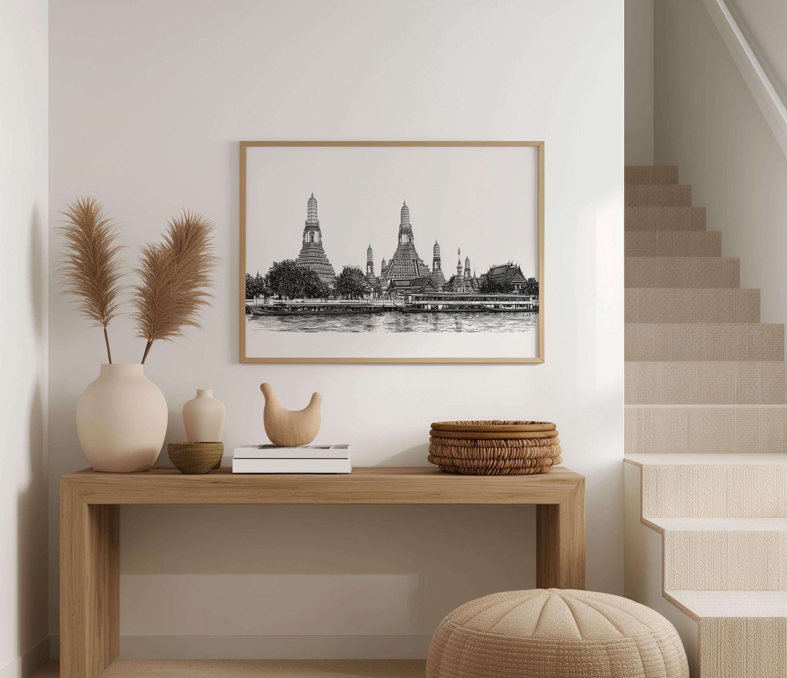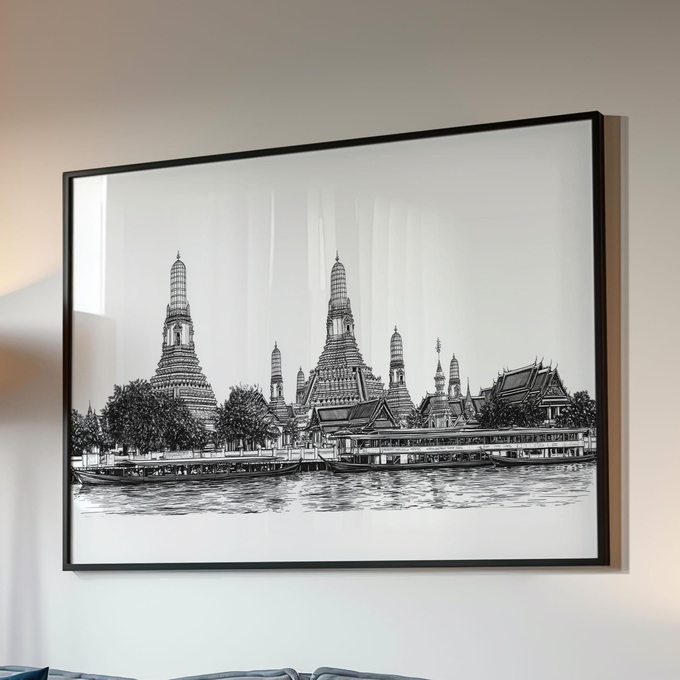 Bangkok Thailand Poster - Black White Cityscape Wall Art Thai Temple Line Drawing Riverside Skyline Print