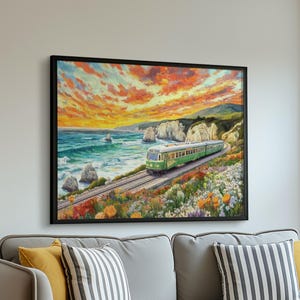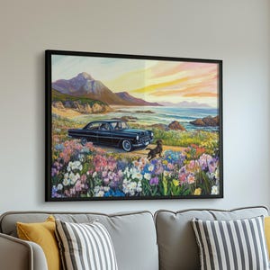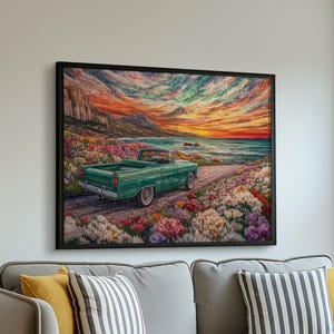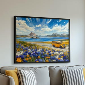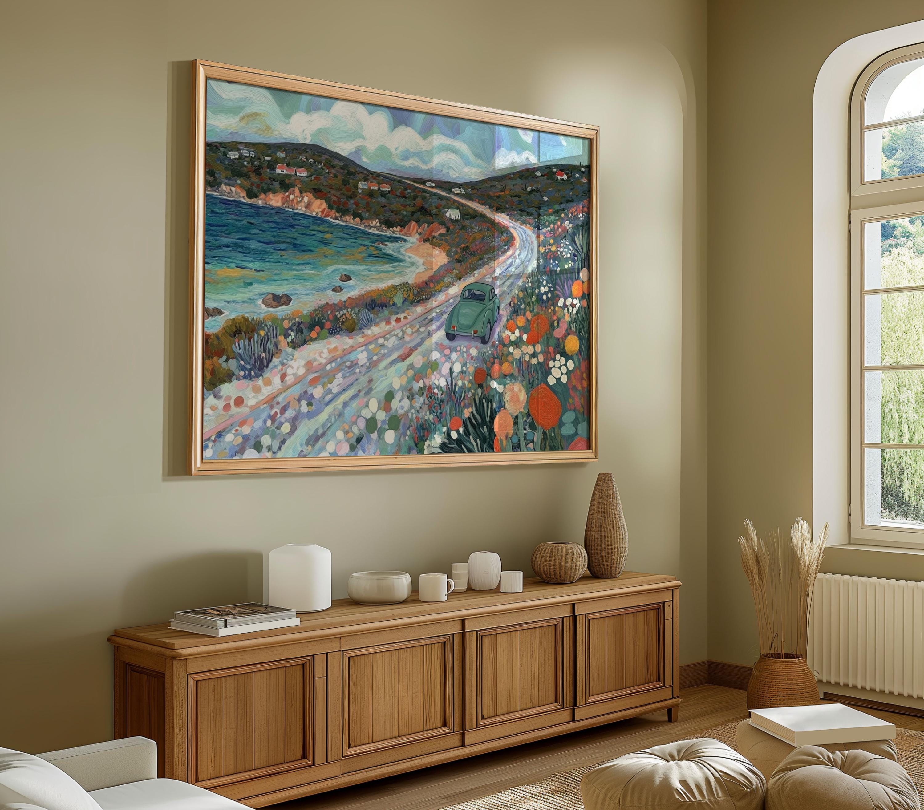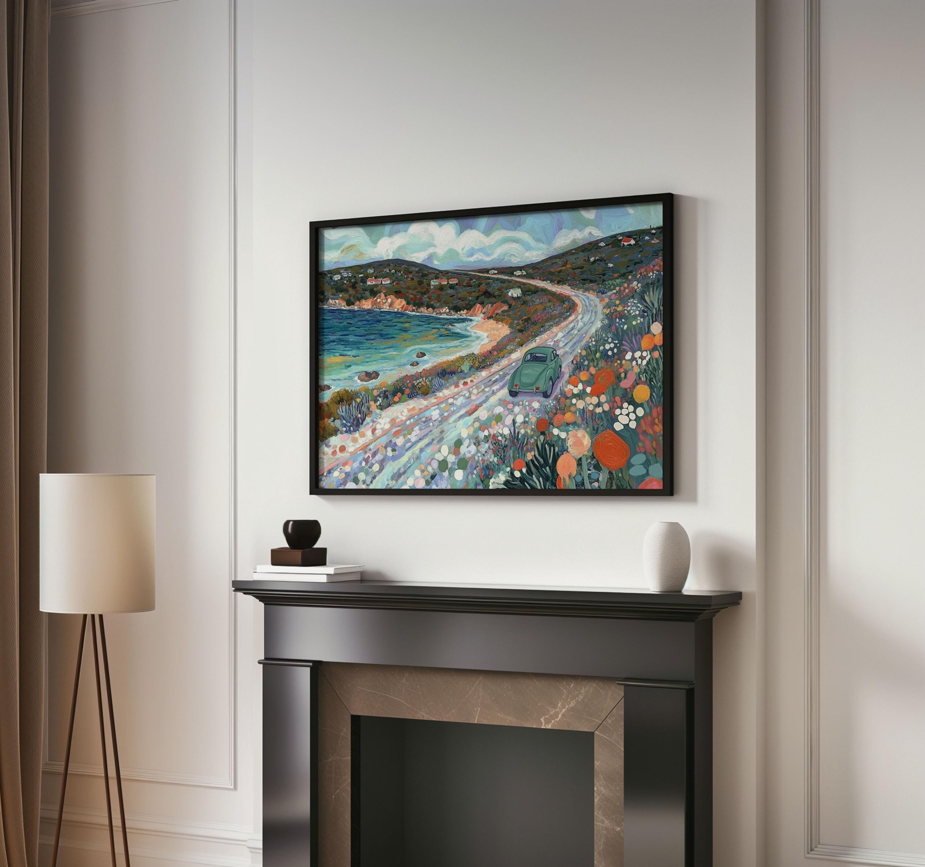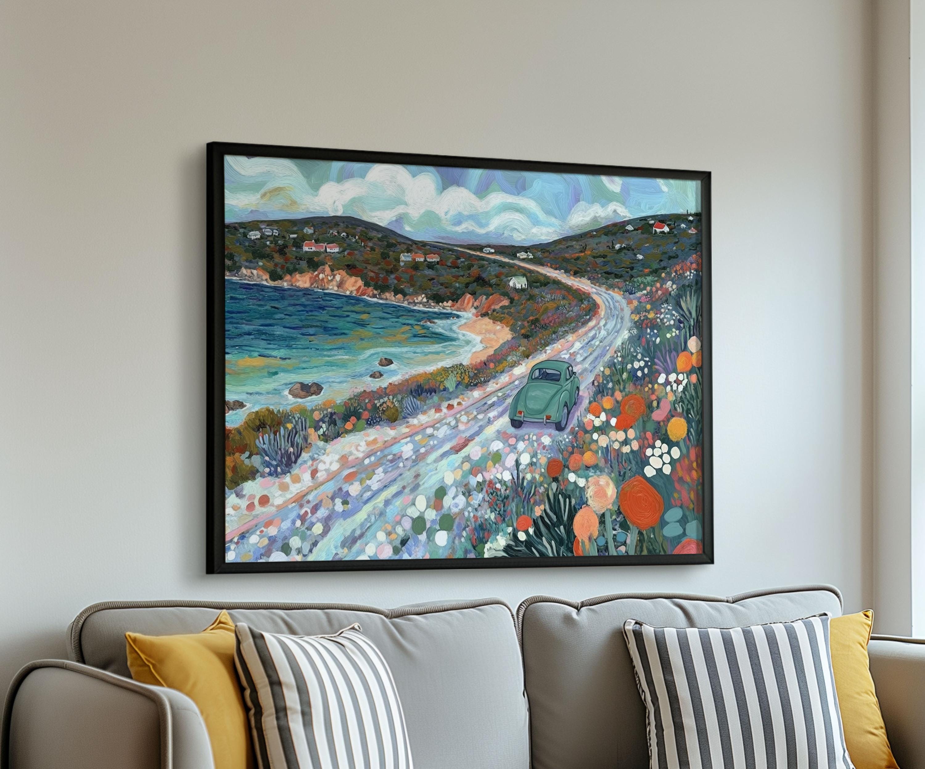 Bring joy, color, and wanderlust into your home with this dreamy art print, inspired by the expressive brushwork of Van Gogh and the free-spirited essence of a 1960s road trip. A flower-covered vintage bus cruises along a vibrant wildflower coast at sunset, framed by glowing skies and crashing waves—perfect for boho, eclectic, and nature-inspired interiors.