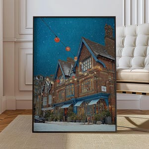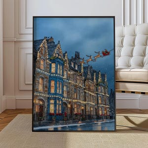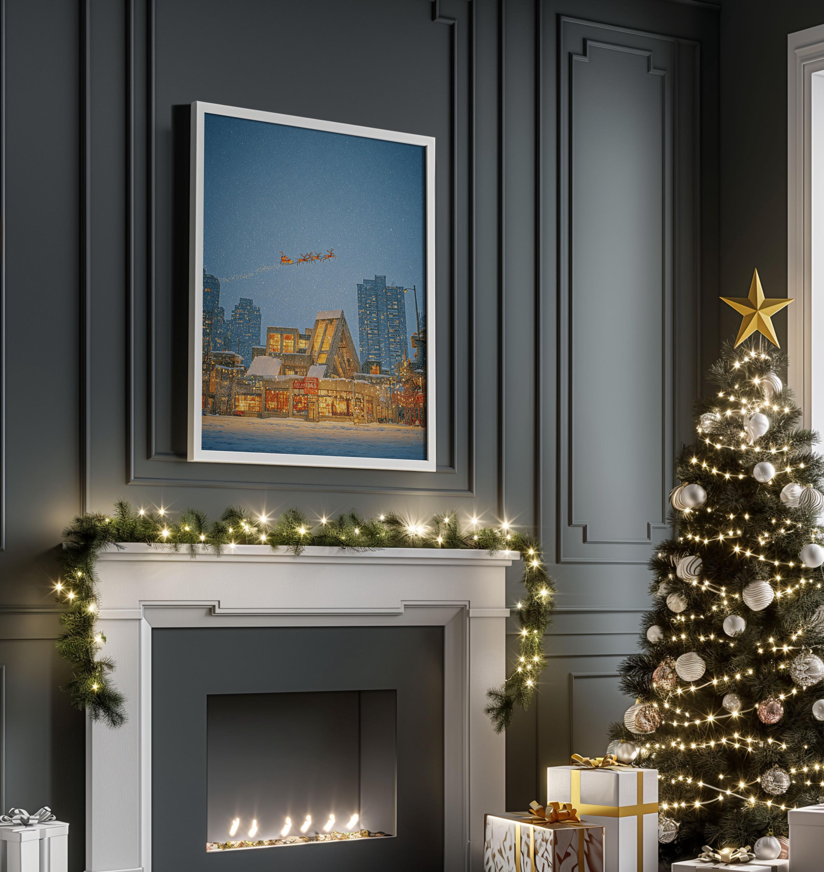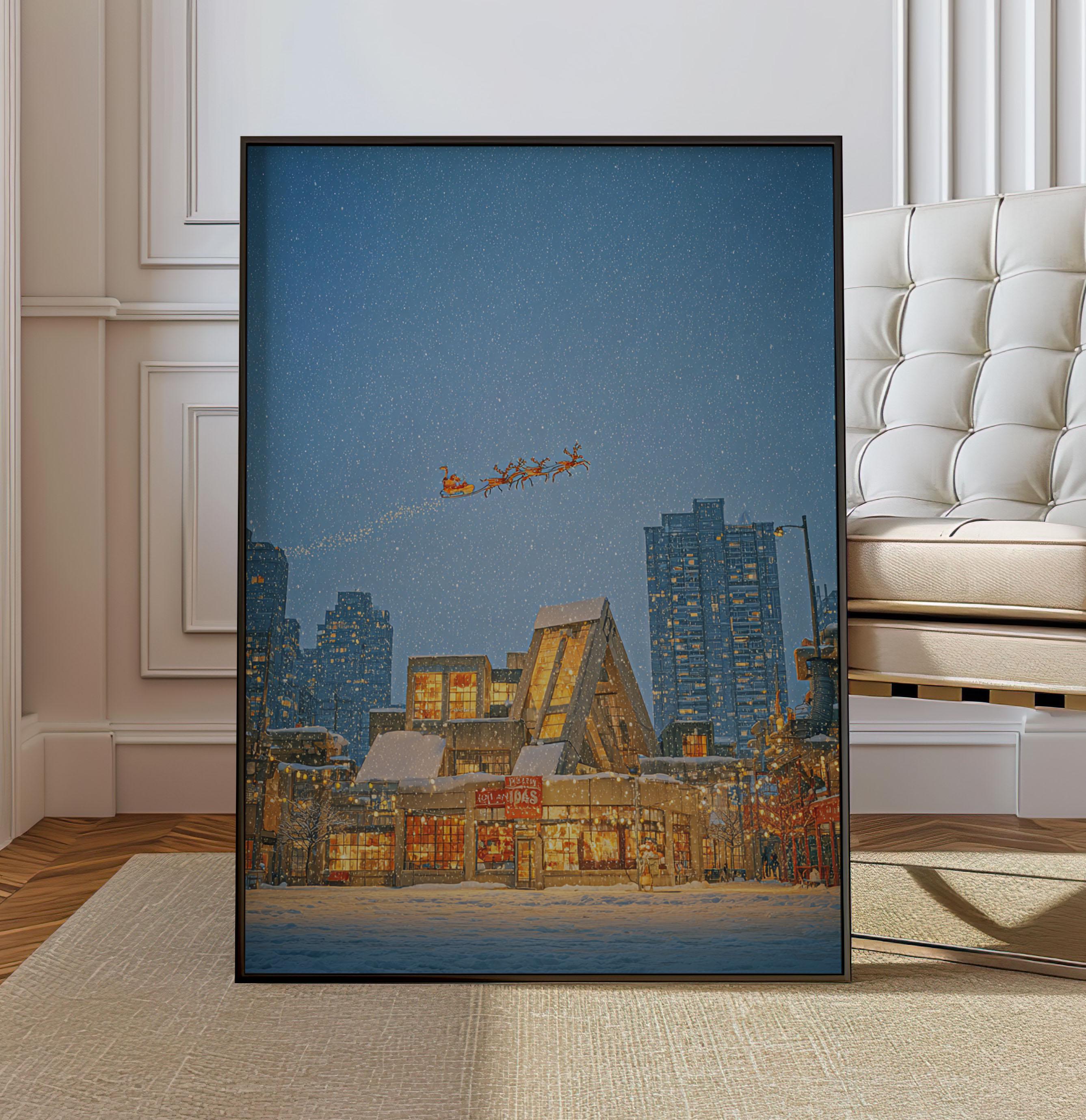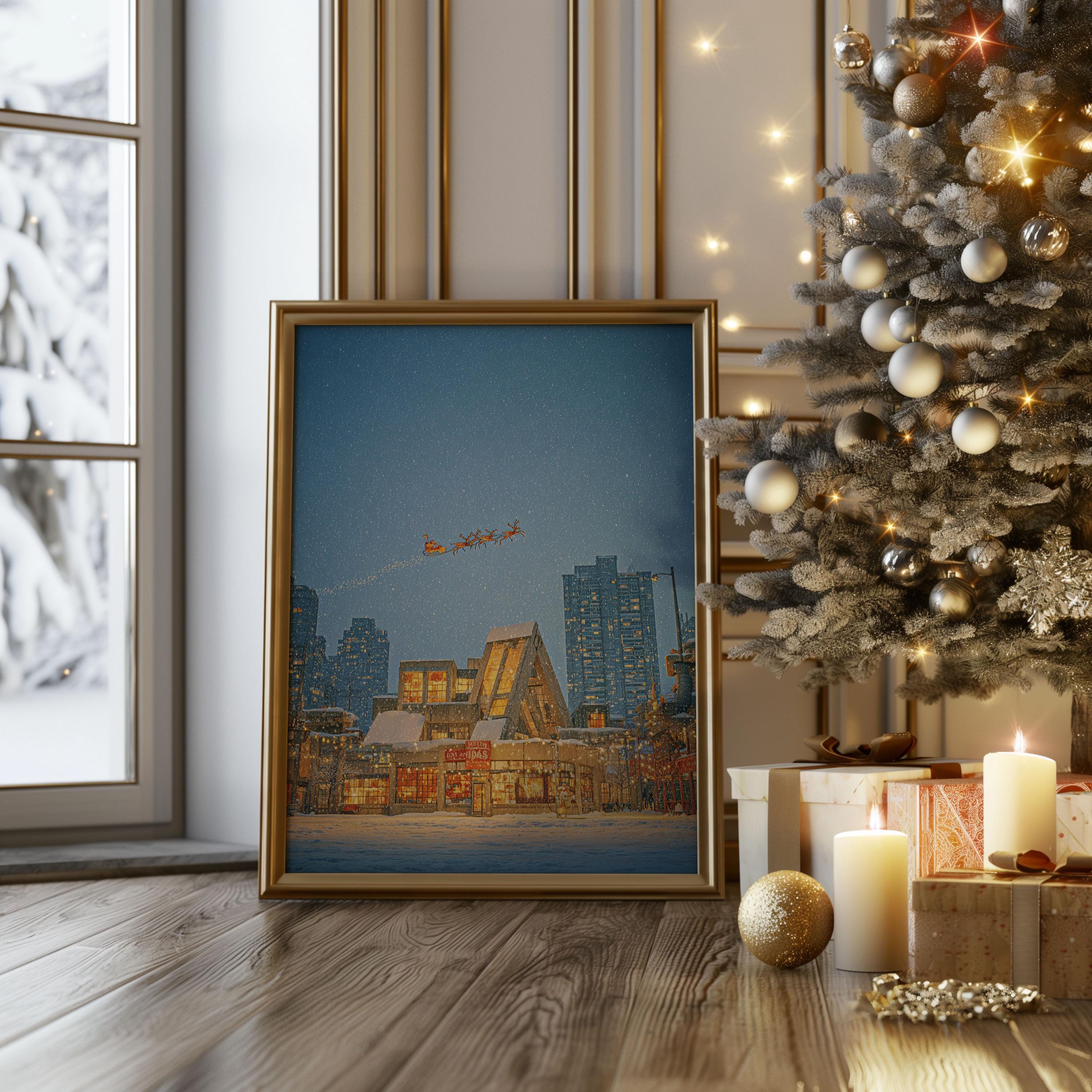 Celebrate the cozy charm of winter with this beautiful Christmas watercolor art print. The artwork features a bright red building nestled in a snowy street, glowing warmly against the sunset sky, while Santa and his reindeer fly above. Perfectly blending festive spirit and whimsical detail, this piece brings holiday magic to your walls.