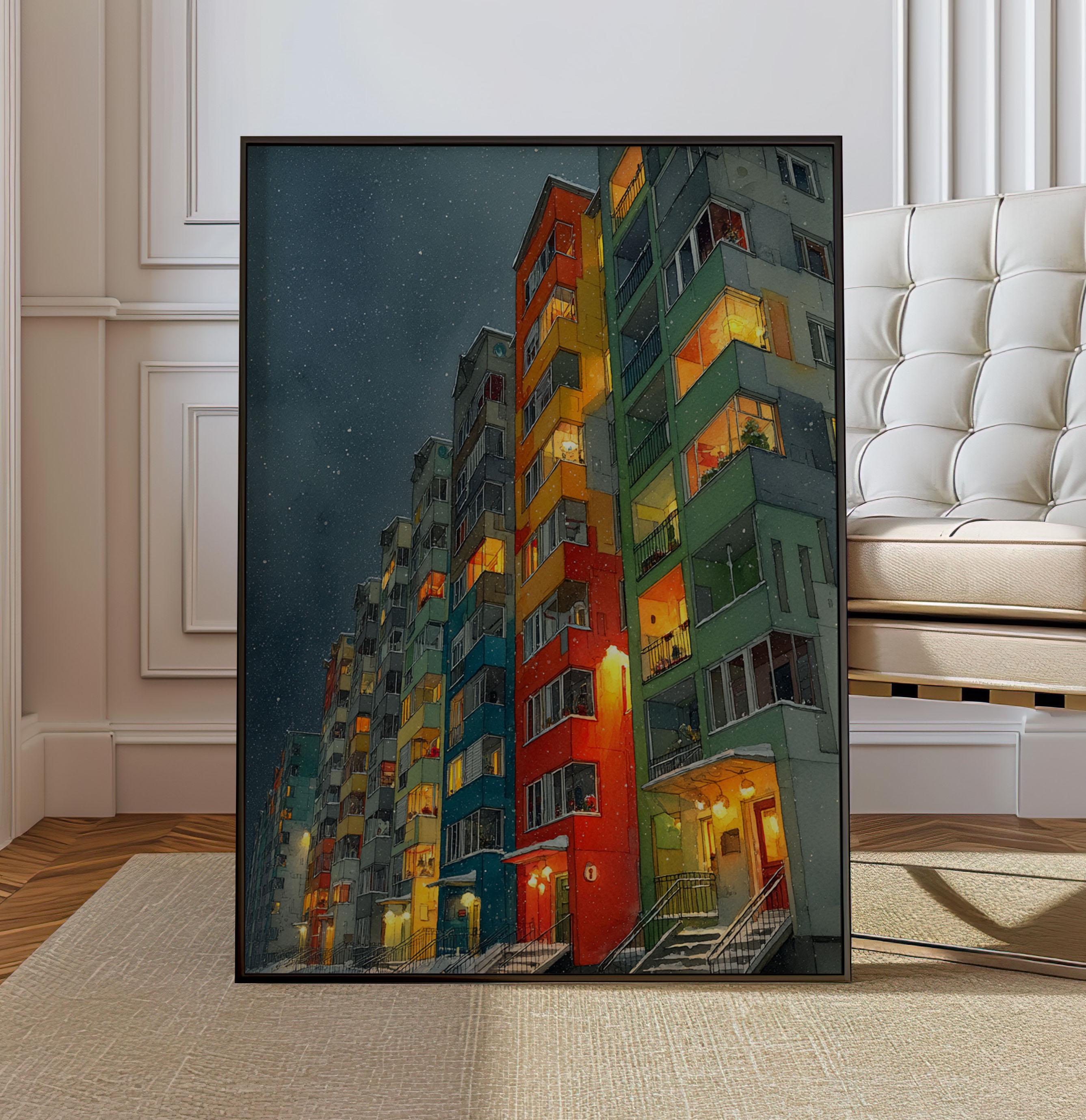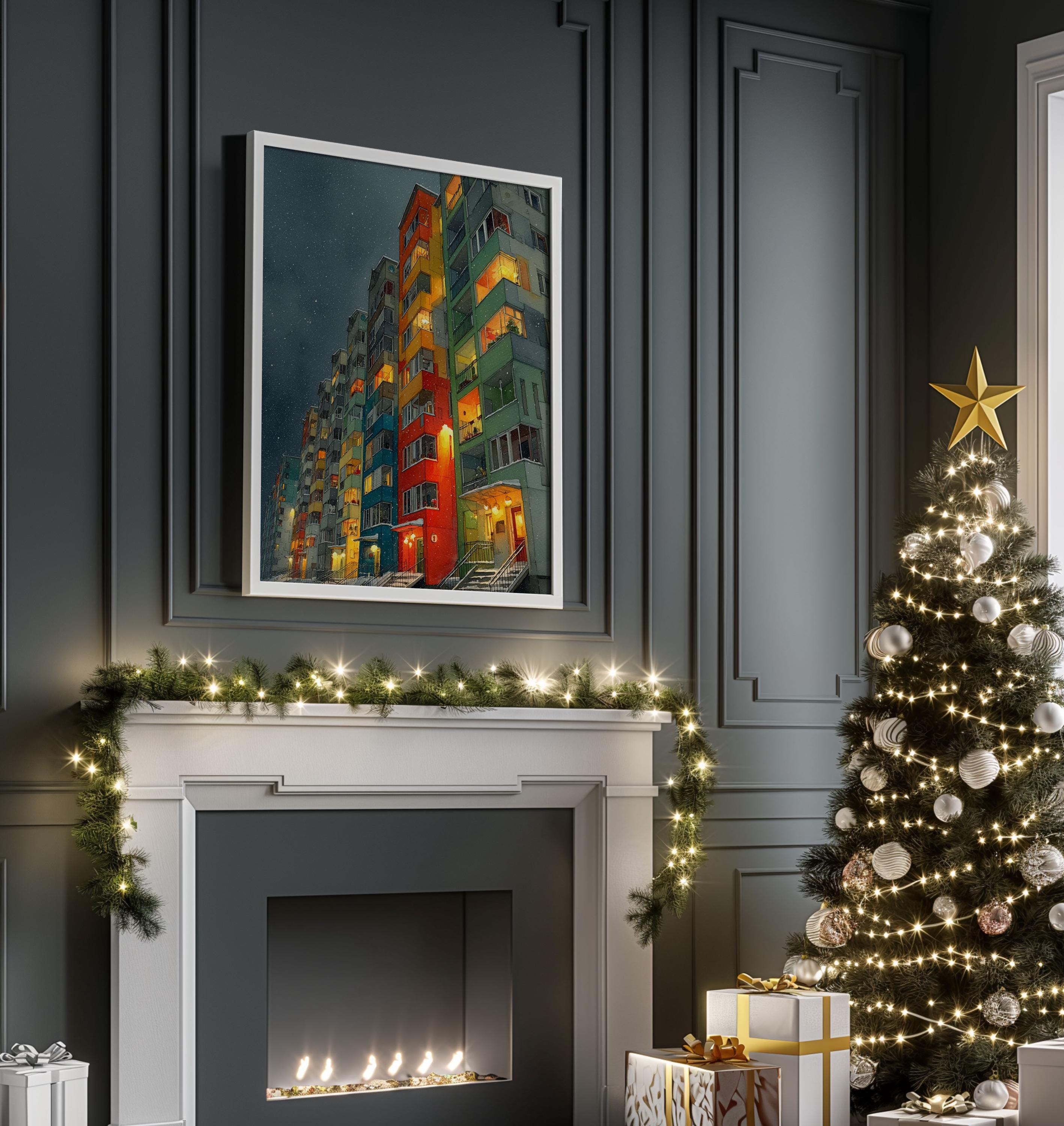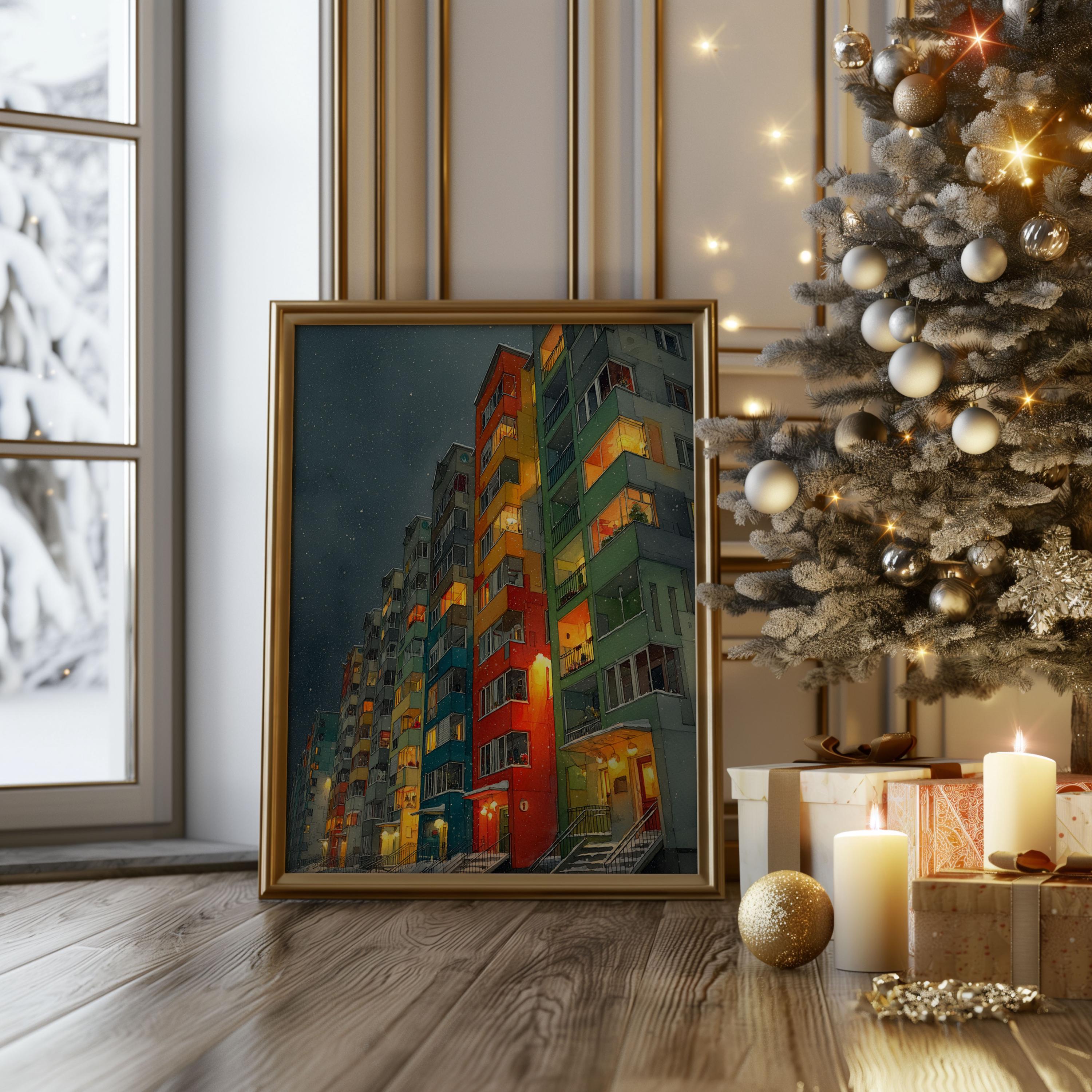 Step into a magical world with this Winter Wonderland Village Poster, featuring a cozy, snow-covered town filled with vibrant pastel buildings and charming European-style architecture. This enchanting winter scene captures the joy of the holiday season